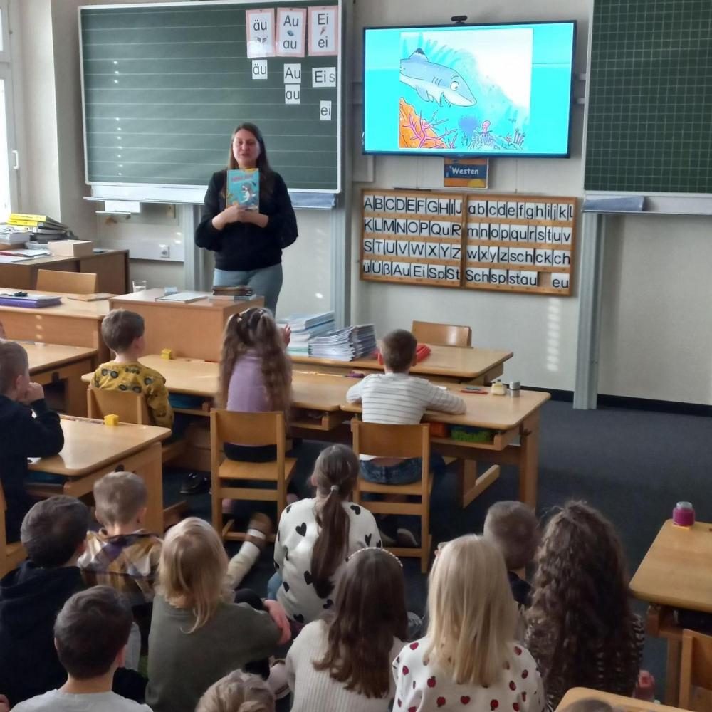 Die Kinder- und Jugendbuchautorin Ruth Anne Byrne las aus ihrem Buch „Haki Hai“ vor. Veranschaulicht wurde die Lesung mit Bildern am Klassenbildschirm. Außerdem besprach Frau Byrne gemeinsam mit den Kindern die Lebensweise und den Lebensraum von Haien, da sie auch studierte Meeresbiologin ist.